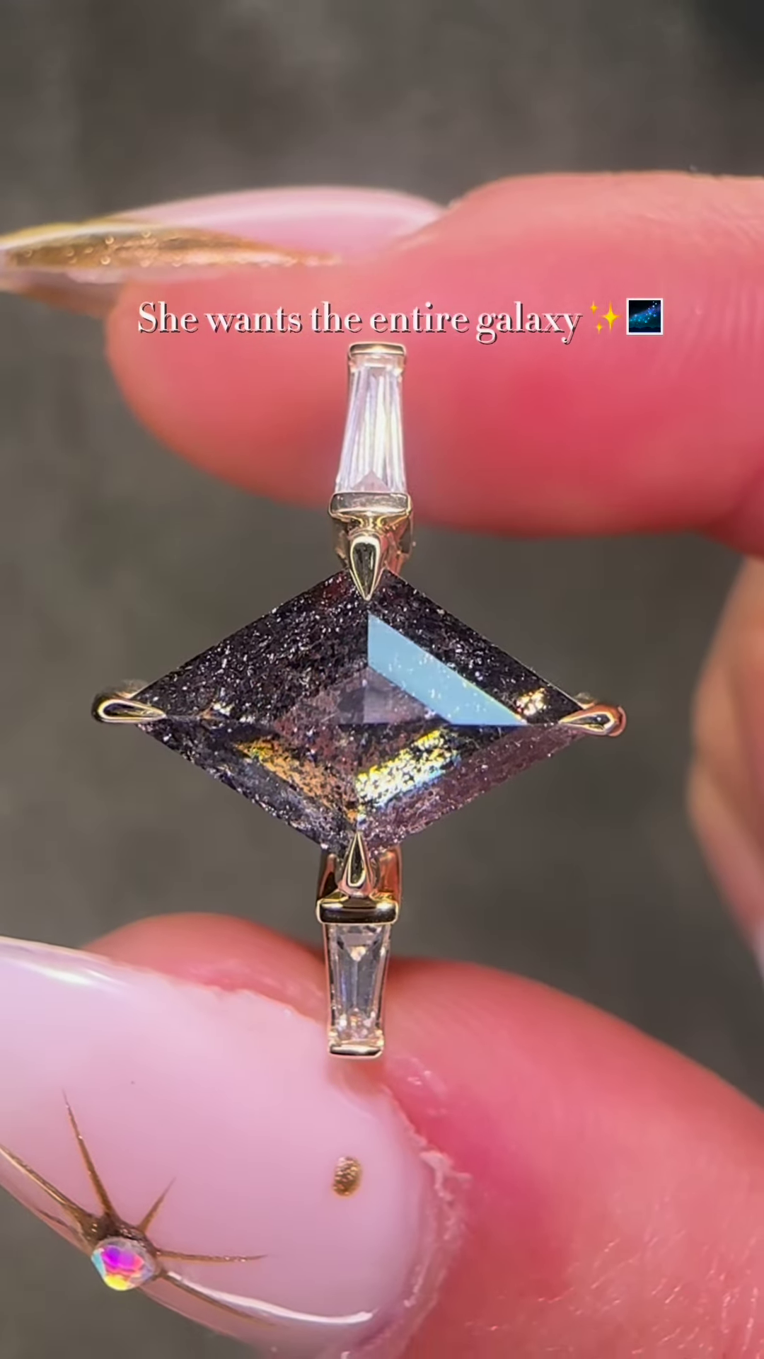 This artisan gold-toned kite-cut salt and pepper diamond ring with baguette accents is an exceptional choice for those seeking a unique engagement ring that reflects individuality and appreciation for natural beauty. It also serves as a stunning fashion statement ring for daily wear or special events, effortlessly enhancing both casual and formal attire. Its unconventional charm and captivating sparkle ensure it will be a cherished and conversation-starting addition to any jewelry collection.