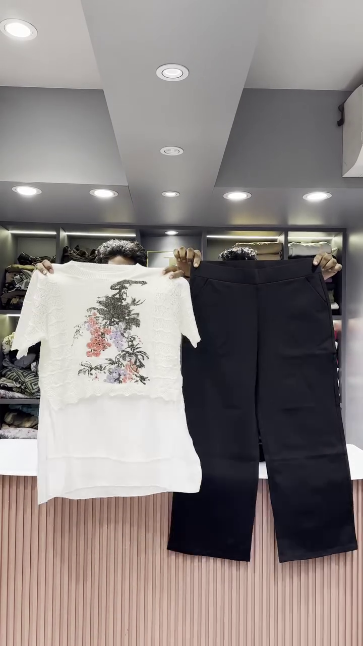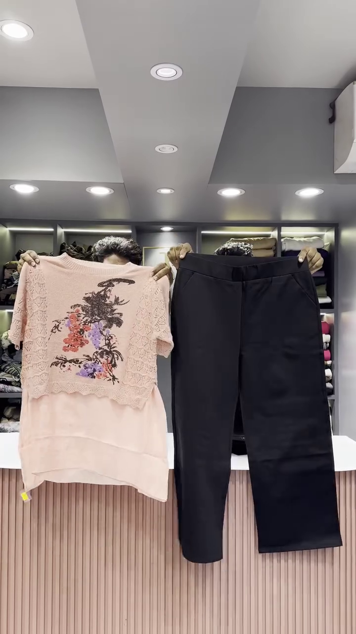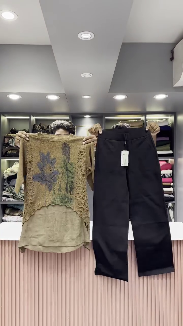 The two pieces are held up side-by-side, allowing the viewer to appreciate the complete look of the set. The setting is a clean and contemporary retail space. The background features a light, fluted counter and shelves neatly arranged with folded clothing, creating a professional and appealing backdrop. The bright, even lighting ensures that all the details of the outfit, from the texture of the open-knit sweater to the smooth finish of the pants, are clearly visible. This ensemble is a perfect example of a cozy yet chic outfit that is both comfortable for everyday wear and stylish enough for a casual outing. The combination of the unique graphic sweater and the sleek black pants creates a harmonious balance of texture, color, and silhouette.
