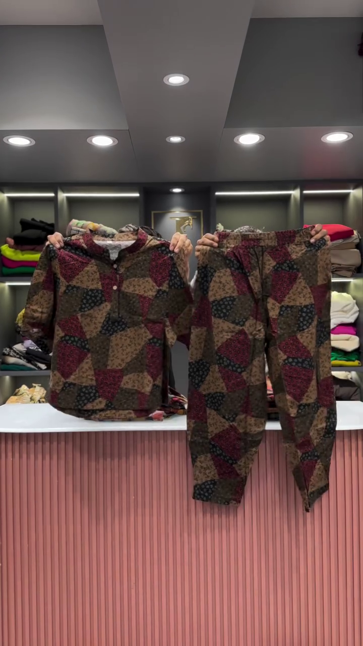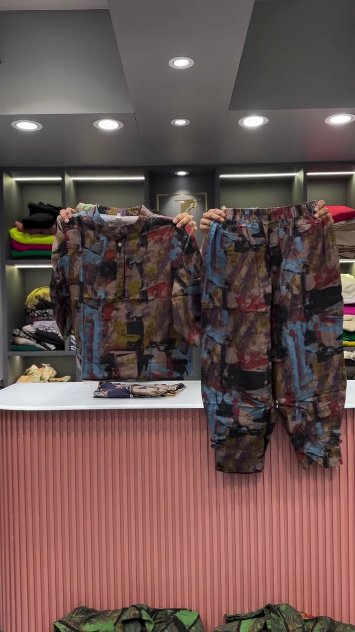 The two garments are presented side-by-side, showcasing their combined effect. The backdrop is a clean and professional retail space. A light-colored, vertically fluted counter is visible in the foreground, providing a clean surface for the presentation. In the background, there are shelves neatly arranged with folded clothing in a variety of colors, which helps to place the outfit within a larger fashion context. The bright, even lighting ensures that the vibrant colors and intricate details of the abstract print are clearly visible, and that the quality of the fabric is well-represented. This two-piece set is an excellent example of an outfit that is both effortless to wear and makes a powerful style statement. Its unique print and comfortable fit make it a versatile addition to any wardrobe, perfect for a casual day out or for someone who wants to express a bold and artistic sense of style.
