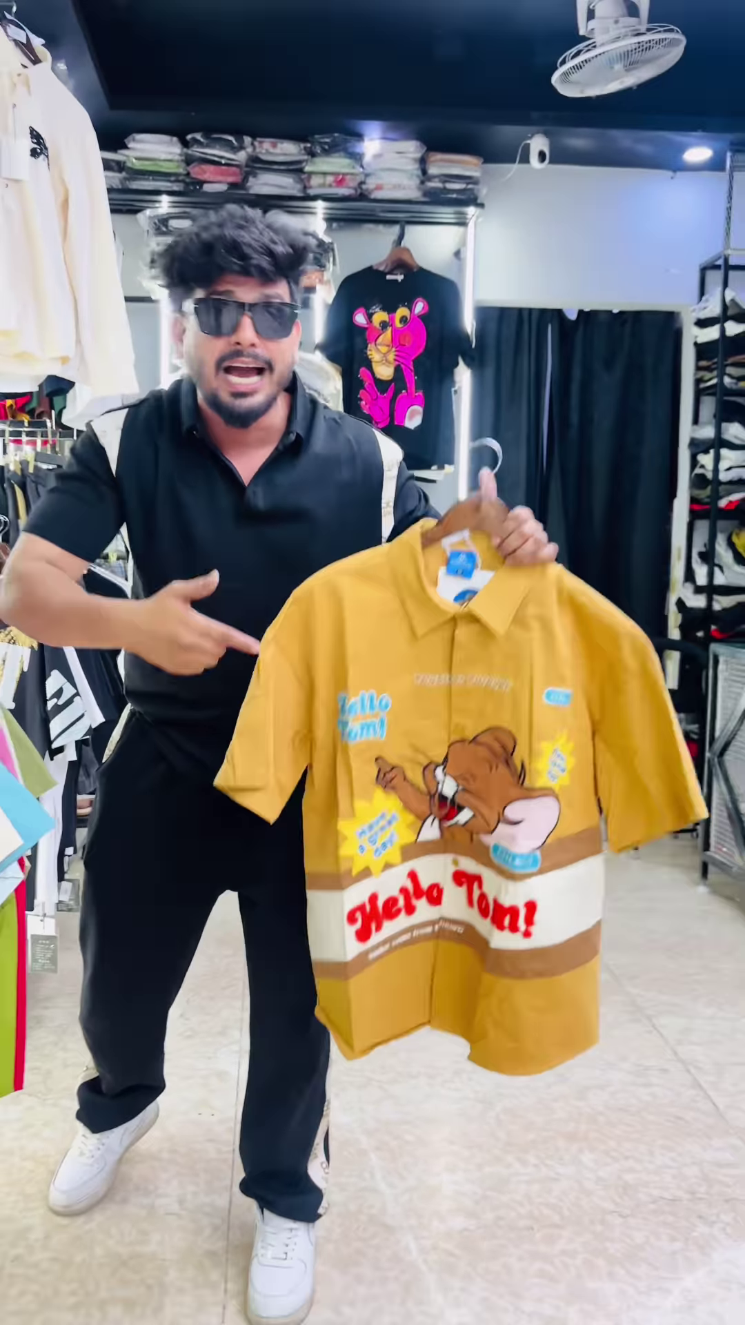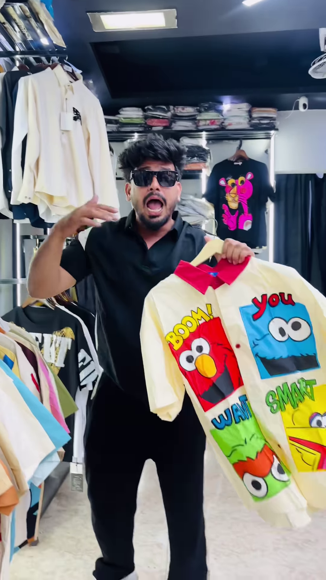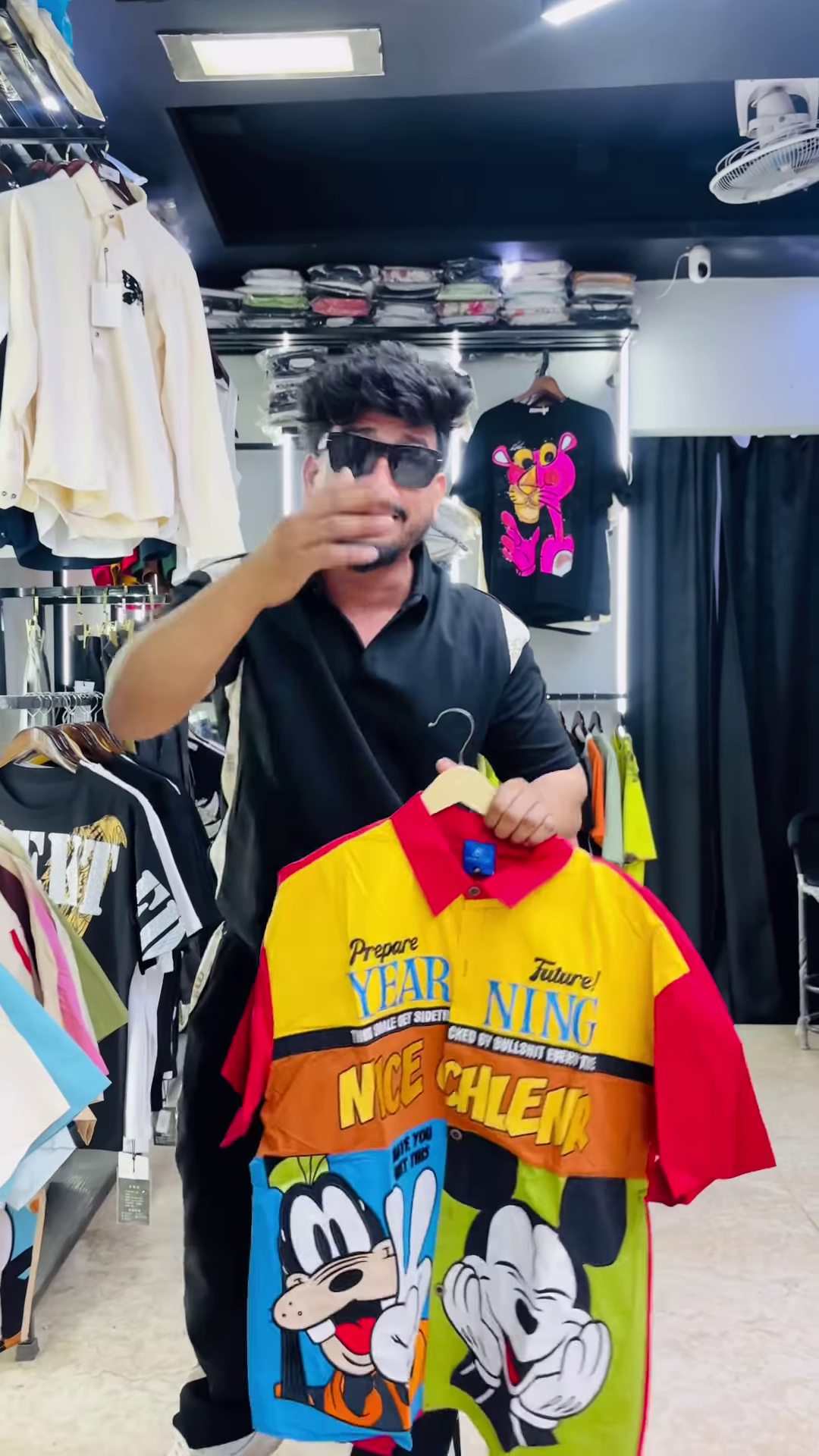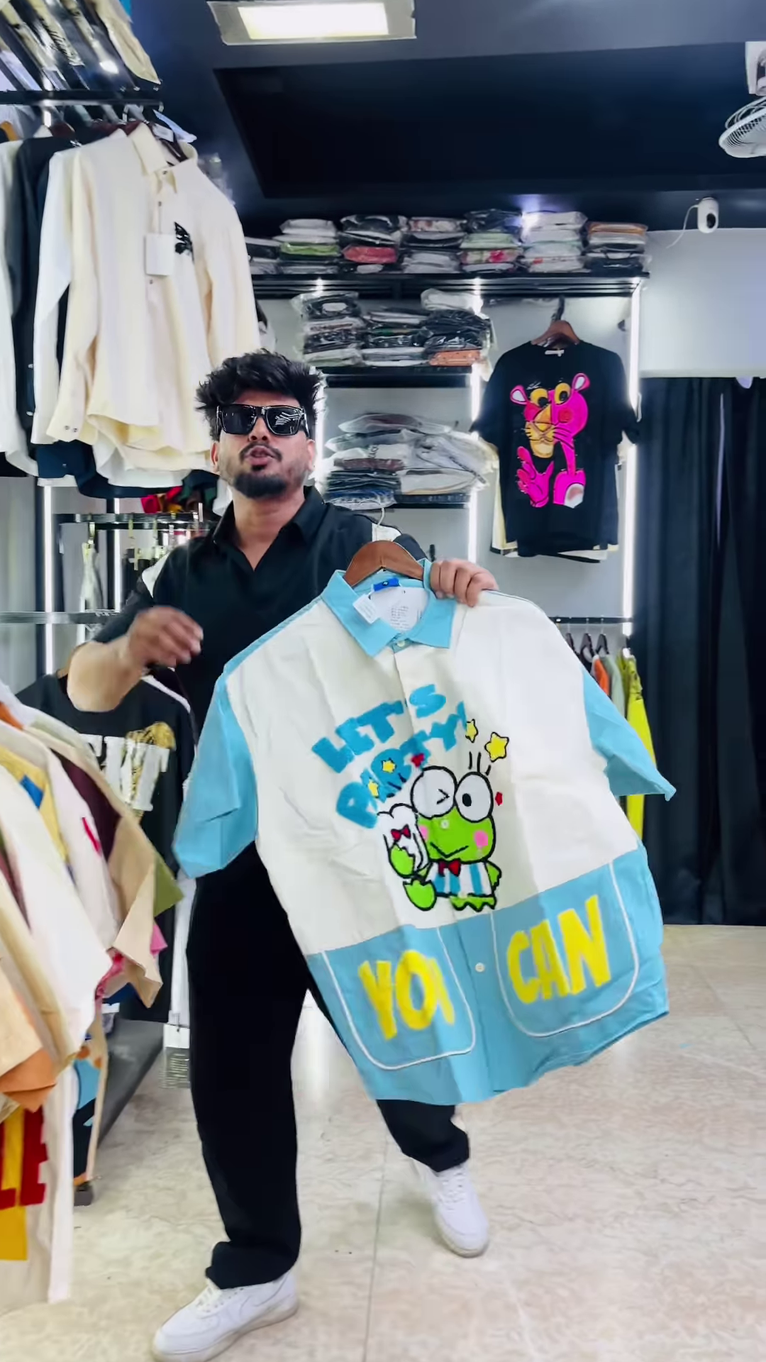 The person holding the shirt is wearing sunglasses and a black short-sleeved shirt, further emphasizing the bold and casual style of the garment being presented. The background shows a retail environment with racks of other clothing, indicating that this is a commercially available item.
