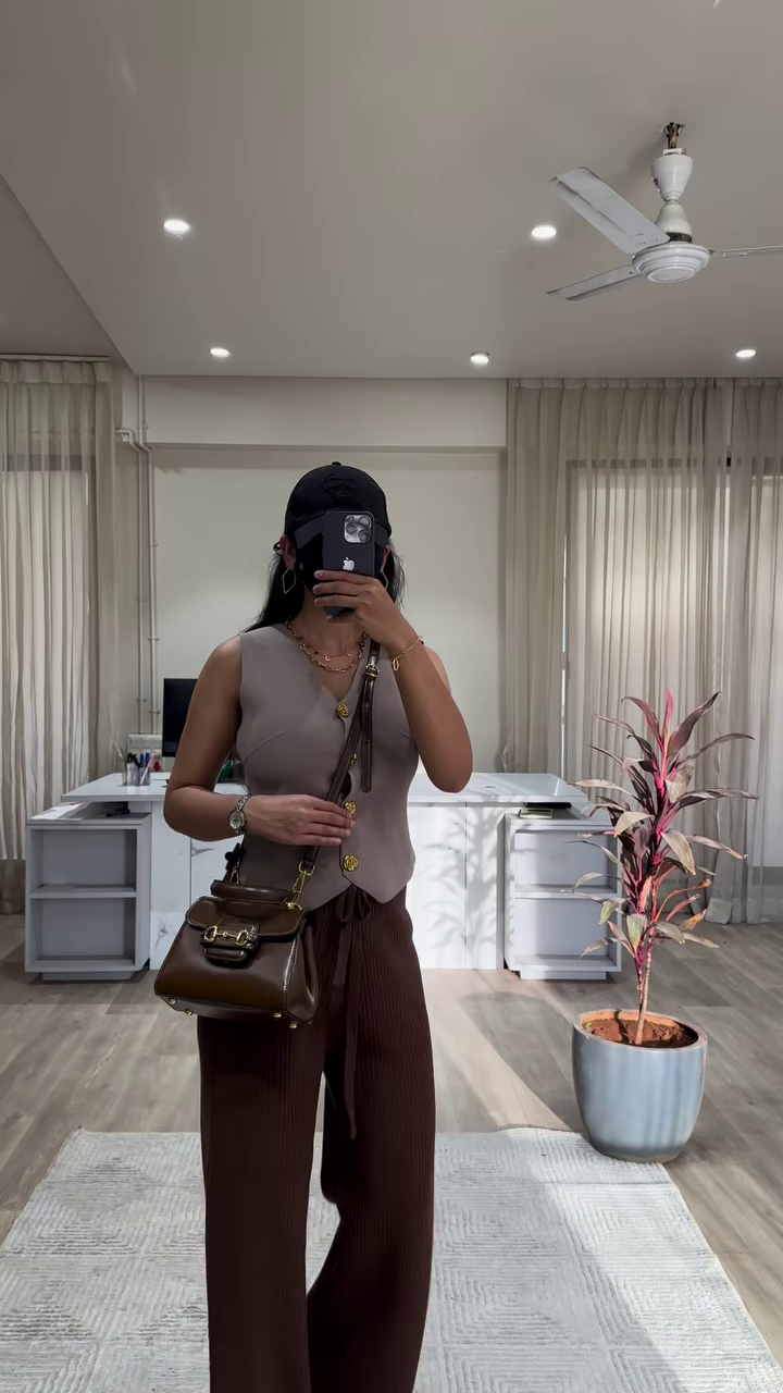 The top is a sleeveless knit garment with a flattering V-neckline and a button-down front. The knit fabric offers a soft and comfortable feel against the skin, ideal for the moderate temperatures often experienced in Ahmedabad. The sleeveless design allows for breathability, while the button front adds a touch of detail and the option to wear it open as a vest or closed as a top. The color of the top is a soft, neutral tone like taupe or light brown, making it easy to pair with other colors and accessories.
