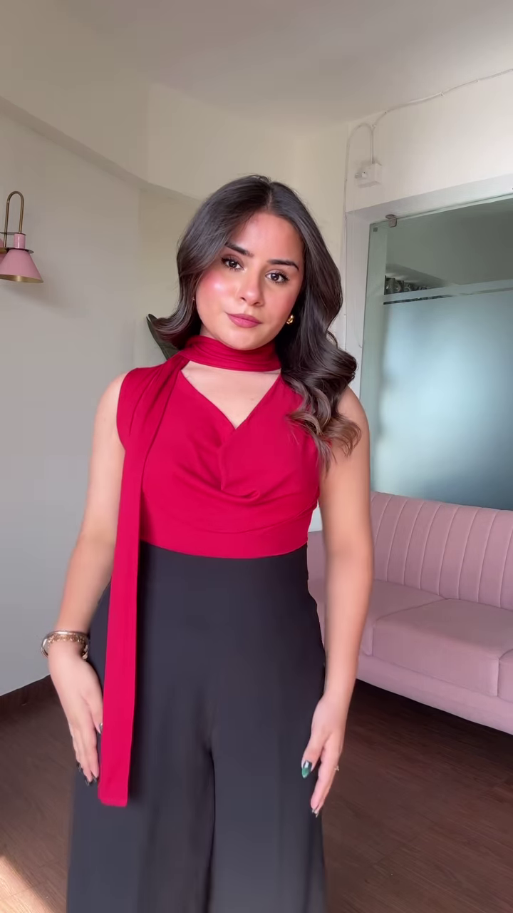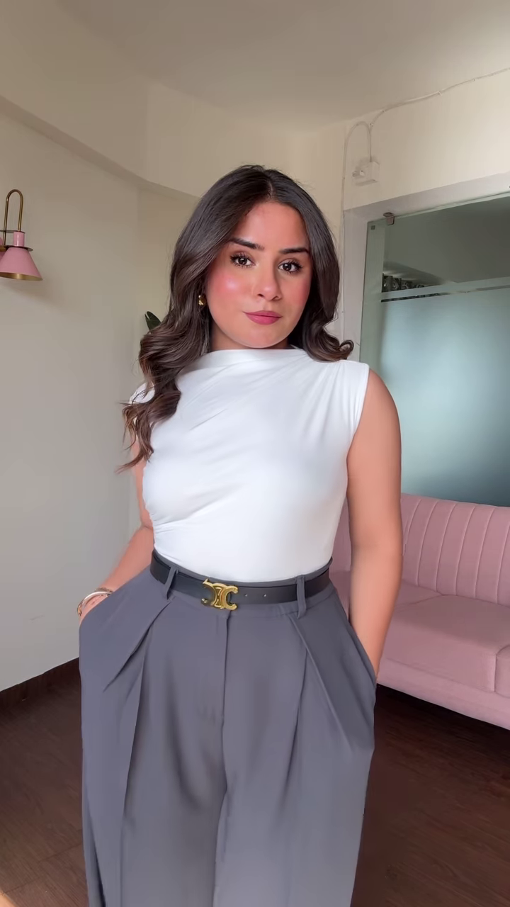 The individual in the image is also wearing delicate gold hoop earrings, adding a subtle touch of elegance to the outfit. Her hair is styled in soft waves, and her makeup is polished, enhancing the overall chic aesthetic.