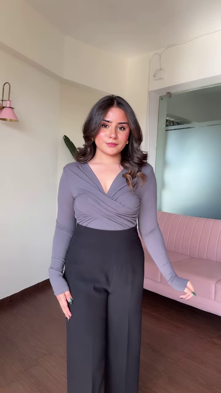 stylish and sophisticated women’s outfit perfect for a smart-casual or semi-formal look. The ensemble features a vibrant blue long-sleeved top with a mock neck paired with elegant high-waisted black wide-leg pants. The combination of the bold top color and the classic black pants creates a balanced and fashionable appearance.