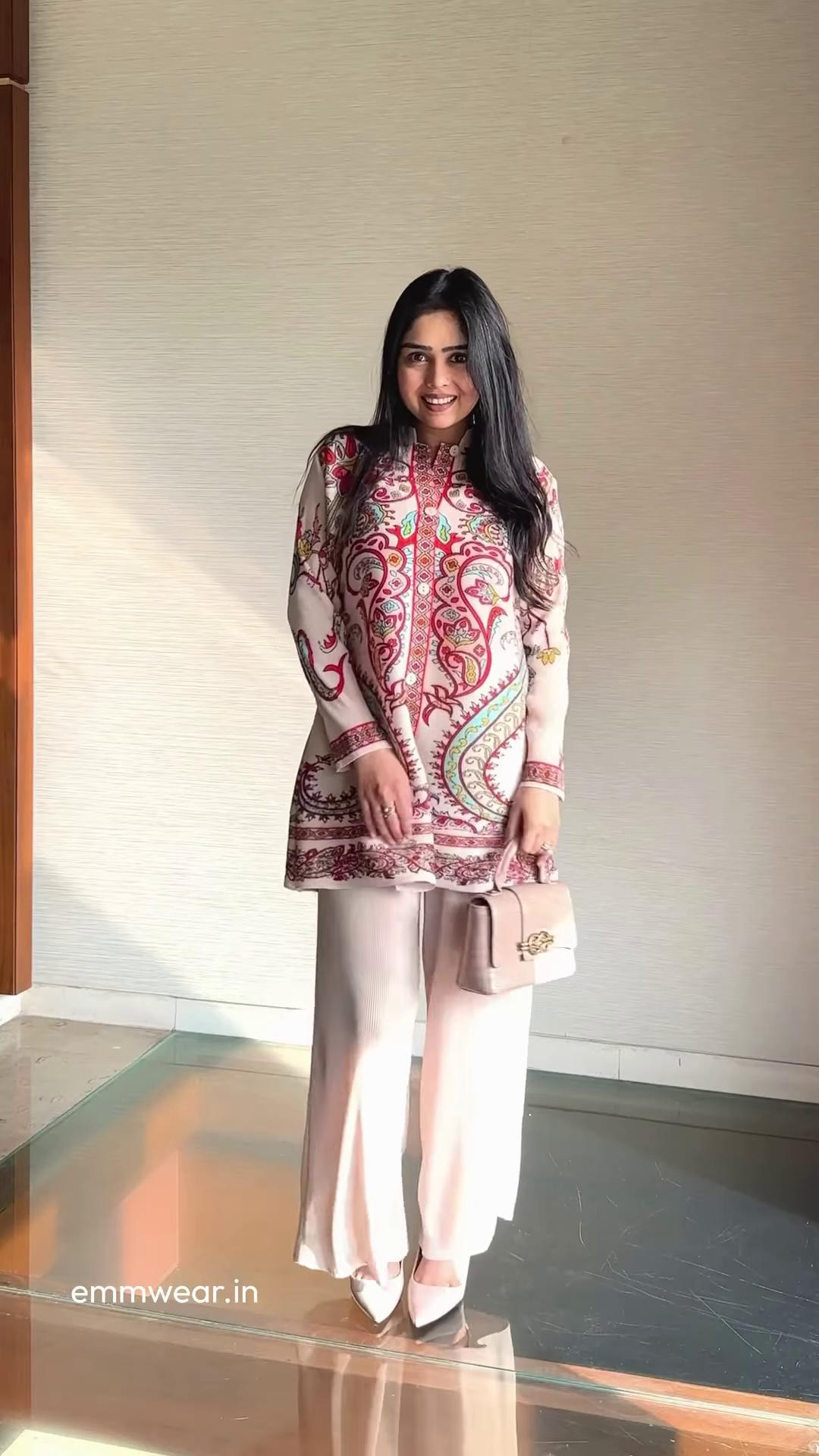The overall impression of the outfit is chic, modern, and sophisticated. The combination of the flowing pleated pants, the artistic ombre blazer, and the structured handbag creates a well-balanced and stylish ensemble. This outfit would be suitable for various occasions, from business meetings to stylish social events, for individuals who appreciate contemporary design with a touch of elegance and individuality. The choice of neutral yet impactful colors makes it versatile while still making a fashion statement.