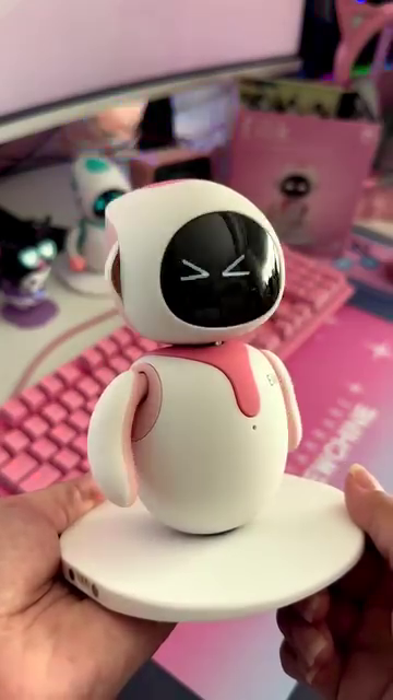 Step into the world of interactive fun with this irresistibly cute AI companion robot—an aesthetic blend of futuristic design and playful personality. Shaped like a chubby little android with rounded features and a glossy black screen face, this desktop buddy lights up with animated expressions, making your workspace or gaming station come alive with emotion and charm.