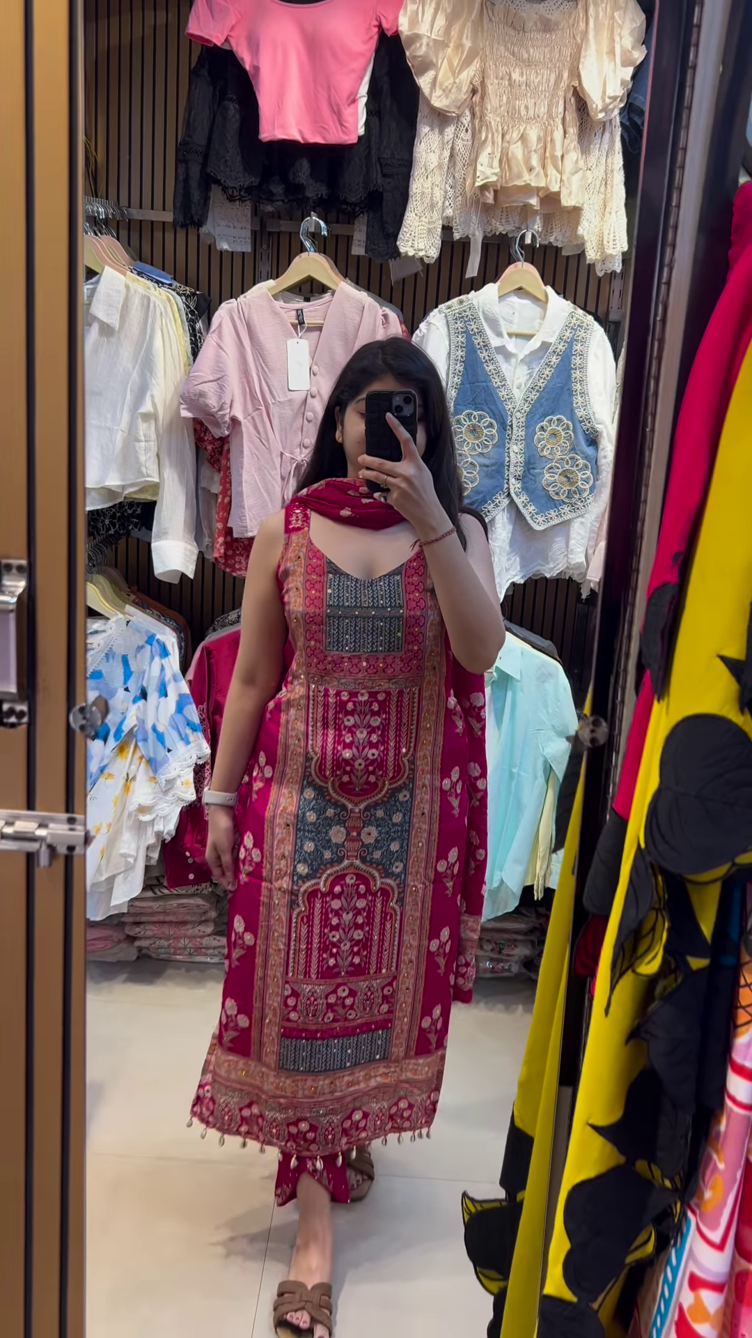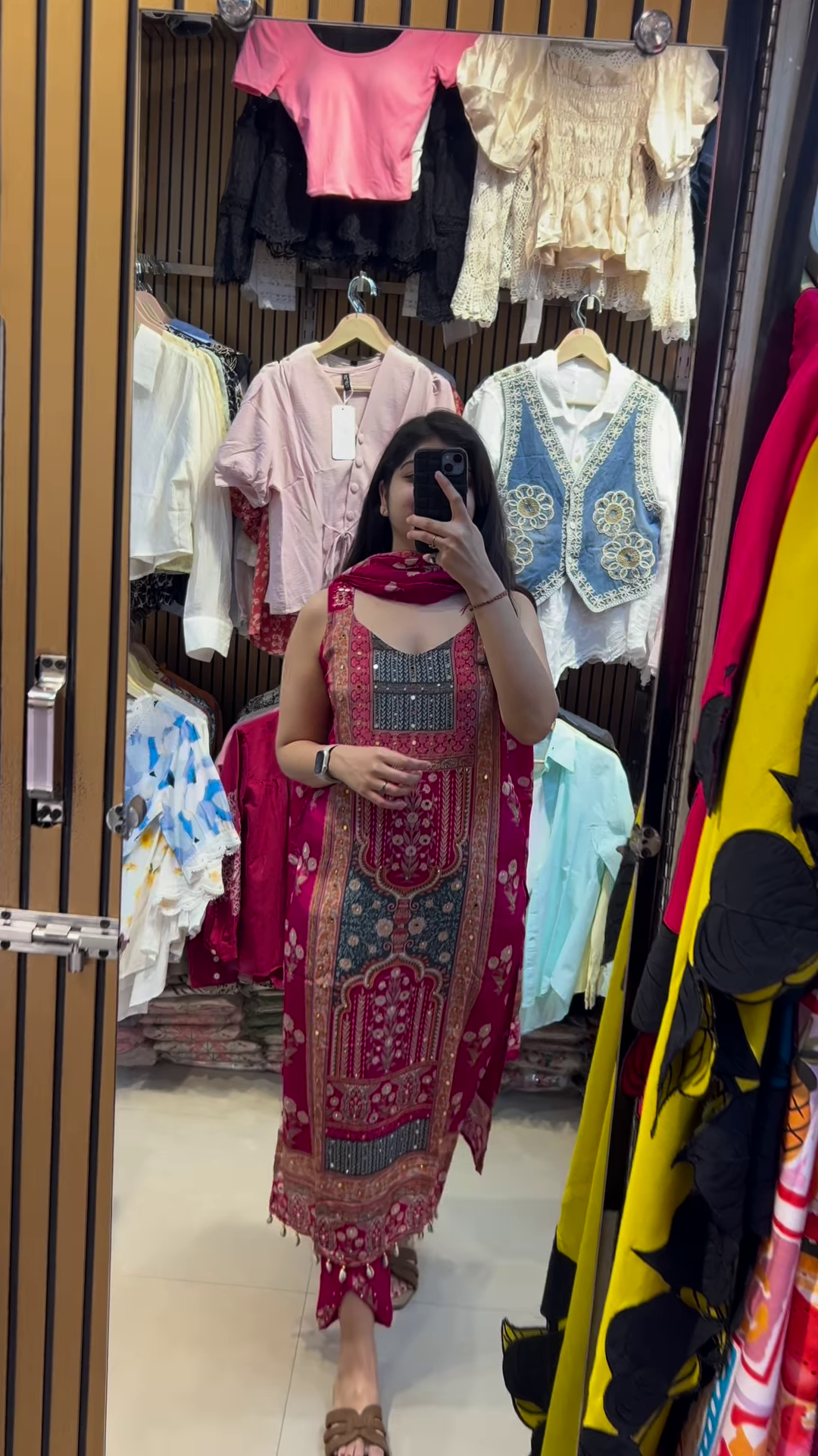 Complementing the kurti is a flowing dupatta that perfectly mirrors the kurti’s floral theme. The dupatta features a beautiful continuation of the colorful floral print, often framed by a contrasting border, such as the subtle light blue-green stripe visible in the image. This harmonious design ensures a cohesive and well-put-together look, elevating the entire ensemble. The generous length and width of the dupatta allow for various elegant draping styles, whether gracefully over one shoulder, wrapped around the neck, or flowing freely for a more dramatic effect. The lightweight fabric of the dupatta ensures comfort and a beautiful fall, adding to the fluidity and charm of the outfit.