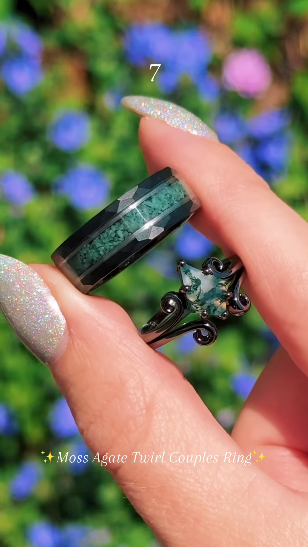 The first ring in this distinguished set presents a powerful and sleek aesthetic. It features a robust, broad band crafted in a deep, lustrous black finish, which provides a striking contrast to the vibrant color it holds. Embedded within this black band is a captivating channel of shimmering purple, possibly tiny crystals or finely crushed stones, which create a continuous line of intense sparkle and color. The purple hue, reminiscent of amethyst, adds a touch of regal charm and individuality to the ring. The design is often angular or faceted on the outer edges, enhancing its modern and masculine appeal while allowing light to play off its surfaces. This ring exudes strength, sophistication, and a contemporary edge, making it an excellent choice for those who appreciate bold and distinctive jewelry. Its substantial feel and eye-catching detail make it a true statement piece that can be worn daily or for special occasions.