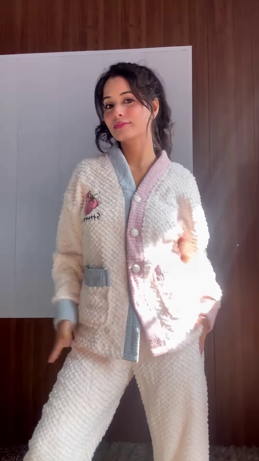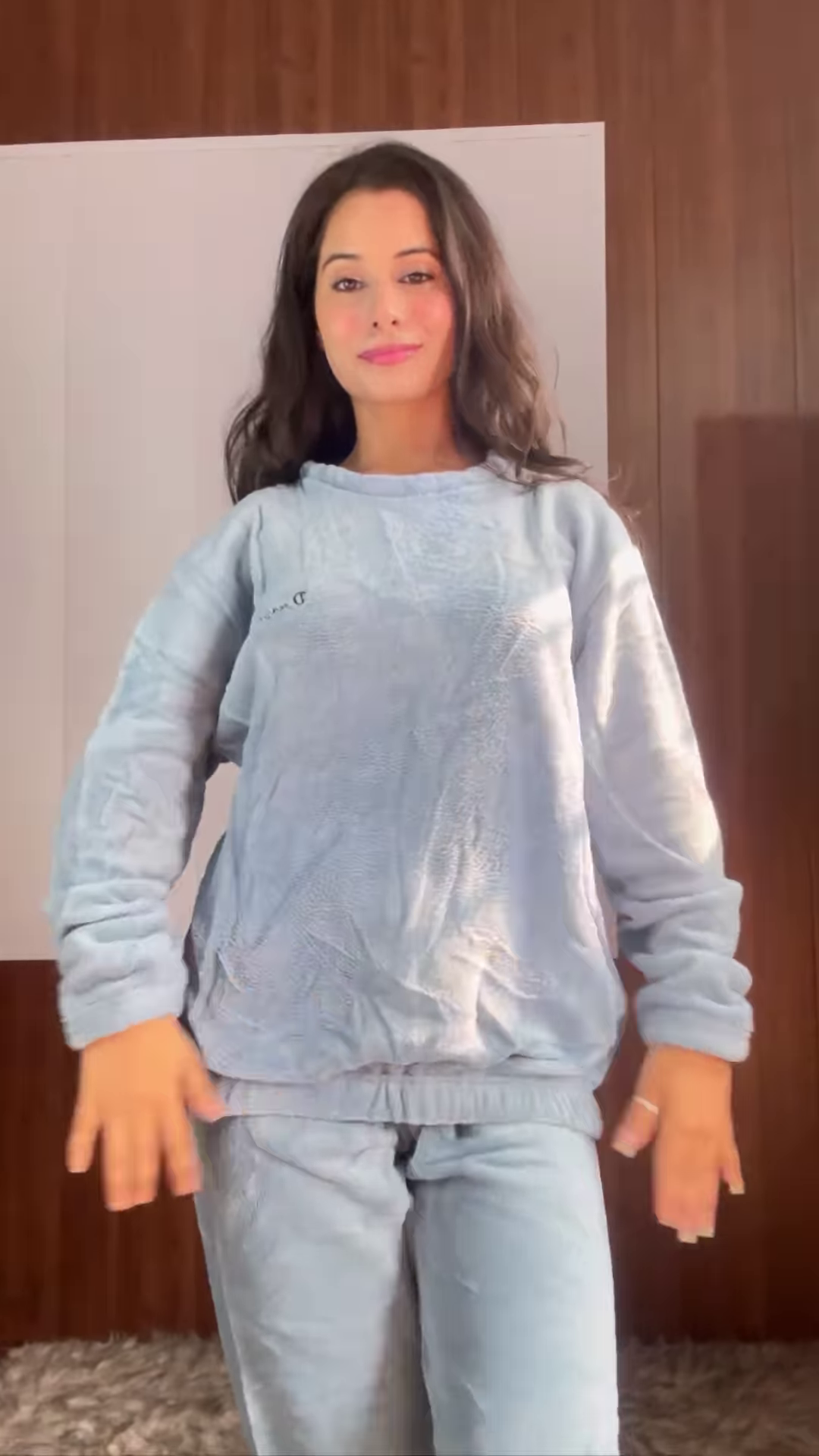 • 🔹 Light Blue Plush: Full-sleeve sweatshirt and matching pants in soft blue fleece + styled on fluffy rug