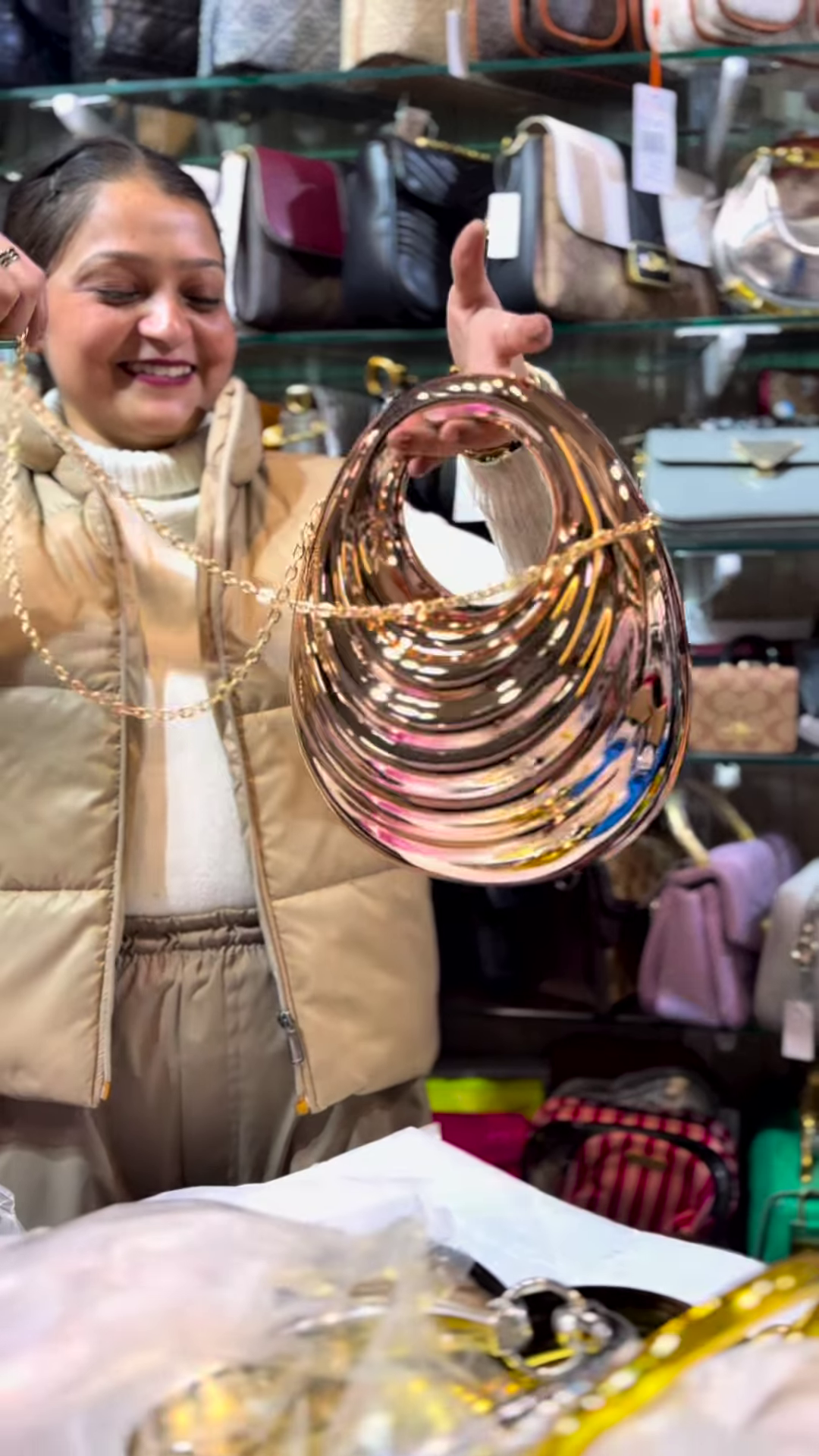 This sculptural rose gold-toned metallic clutch is more than just an accessory; it is a statement piece that speaks volumes about individual style and a keen eye for cutting-edge design. It pairs exceptionally well with formal gowns, sleek jumpsuits, or sophisticated cocktail dresses, adding a touch of bold glamour. For those who appreciate unique, high-impact accessories that stand out from the crowd, this handbag is an exceptional choice, promising to elevate any special occasion look with its contemporary allure and radiant sparkle.