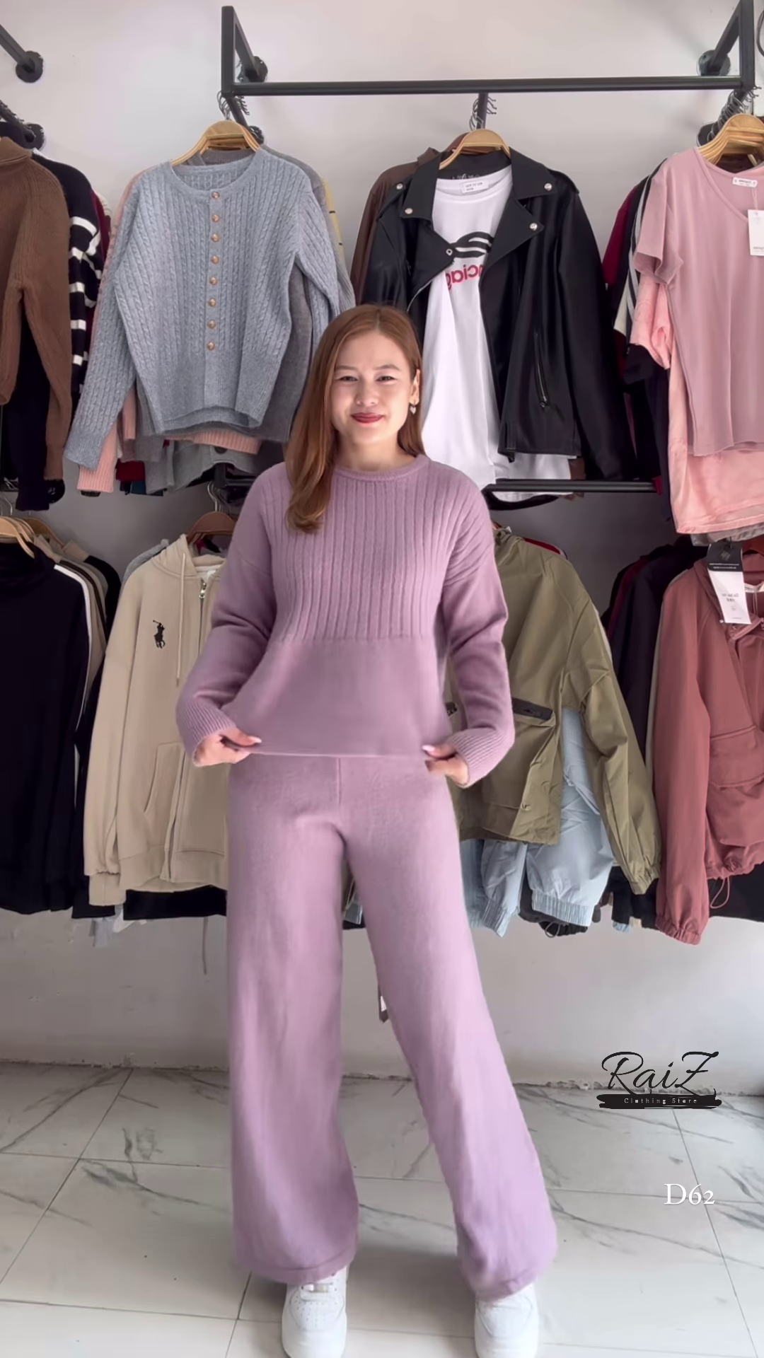 - 🟣 Light Purple: Soft pastel knit with relaxed sweater and matching pants + styled with gentle drape