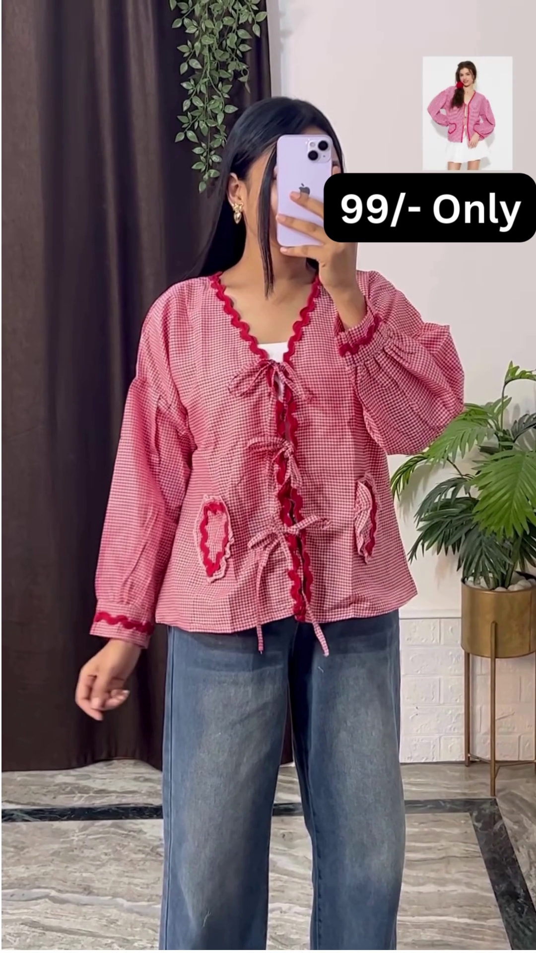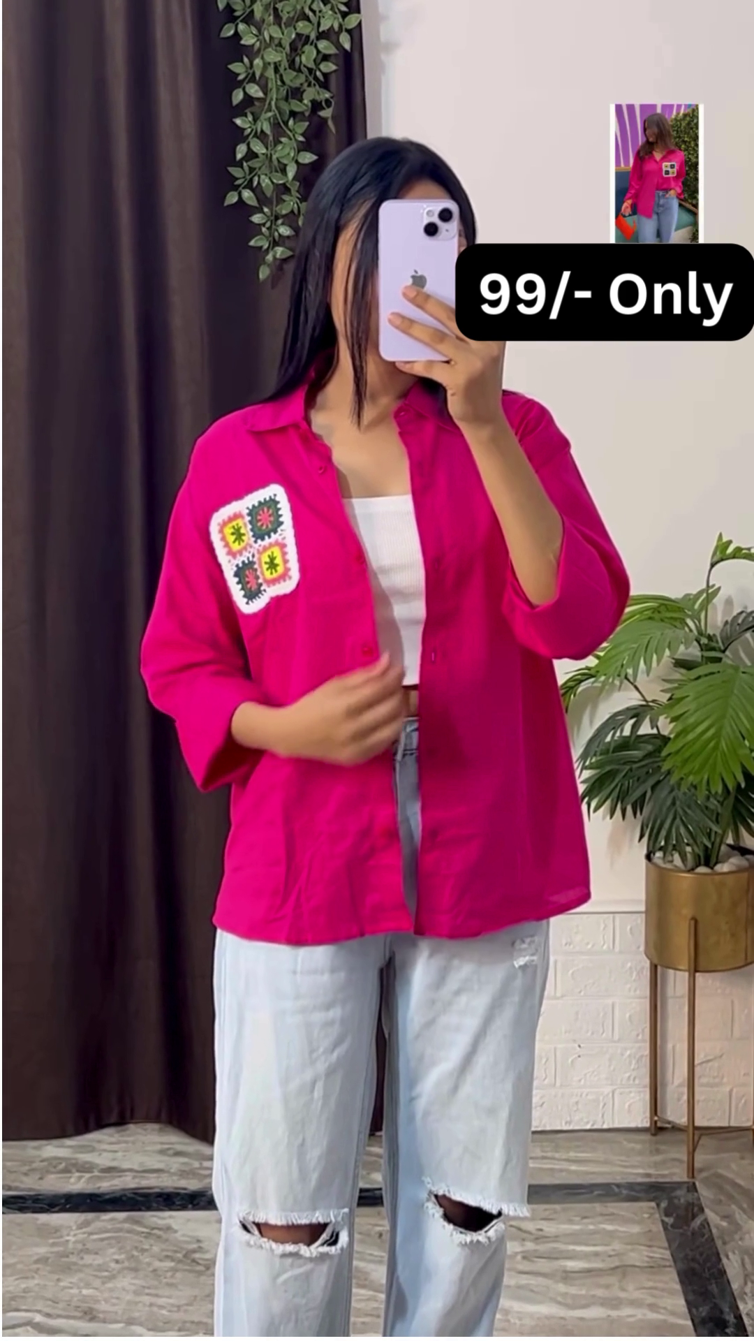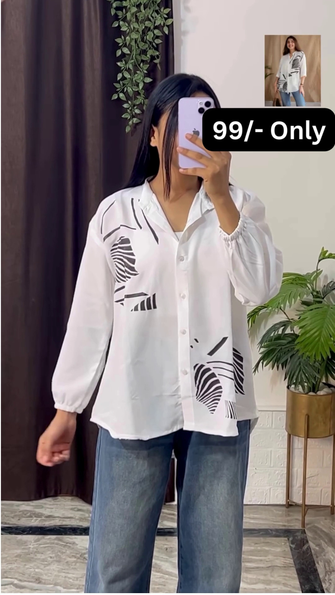 The woman in the image is posing for a mirror selfie, which allows the viewer to see the full outfit from head to toe. Her face is partially obscured by the light purple phone she is holding, directing the focus to the clothing itself. On her wrist, she wears a gold-toned watch with a matching metal band, which adds a touch of classic sophistication to the otherwise casual look. The setting is simple yet stylish, featuring a backdrop of dark brown curtains and a large potted green plant, which complements the warm, neutral tones of the outfit. The bright lighting ensures that all the details, from the texture of the brown shirt to the fit of the jeans, are clearly visible. This ensemble is an excellent example of a fashionable, everyday look that combines comfort with a polished and modern style.