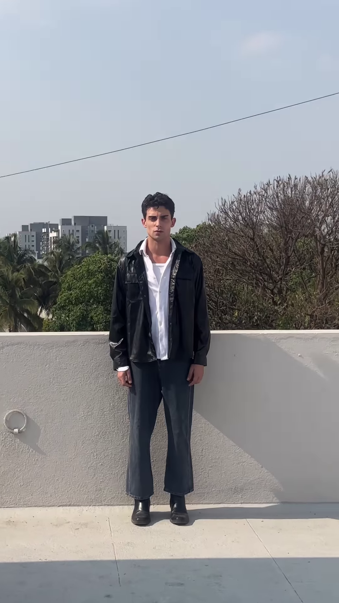 The overall impression is a well-coordinated and stylish outfit that blends casual elements with tailored pieces. The abstract print shirt adds a modern edge, while the pleated trousers provide a touch of classic elegance. The setting further enhances the stylish and relaxed aesthetic of the image.