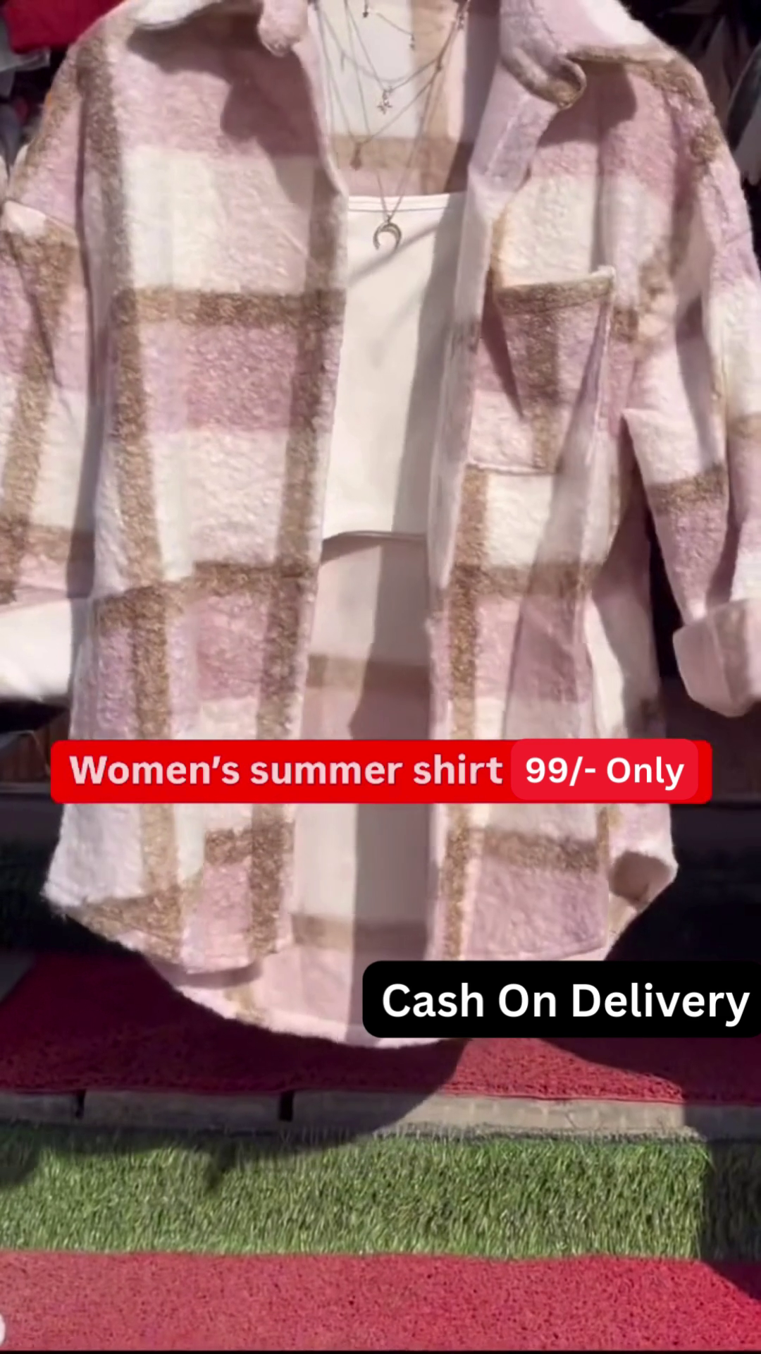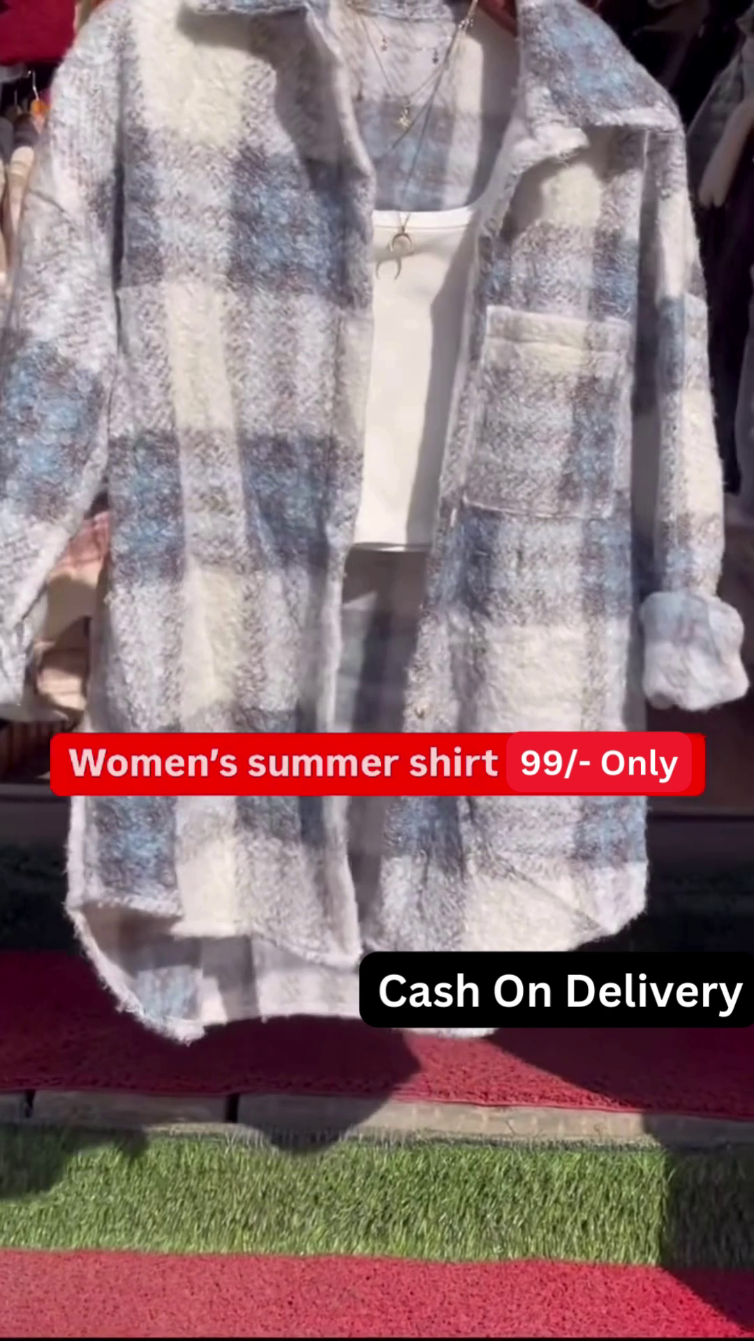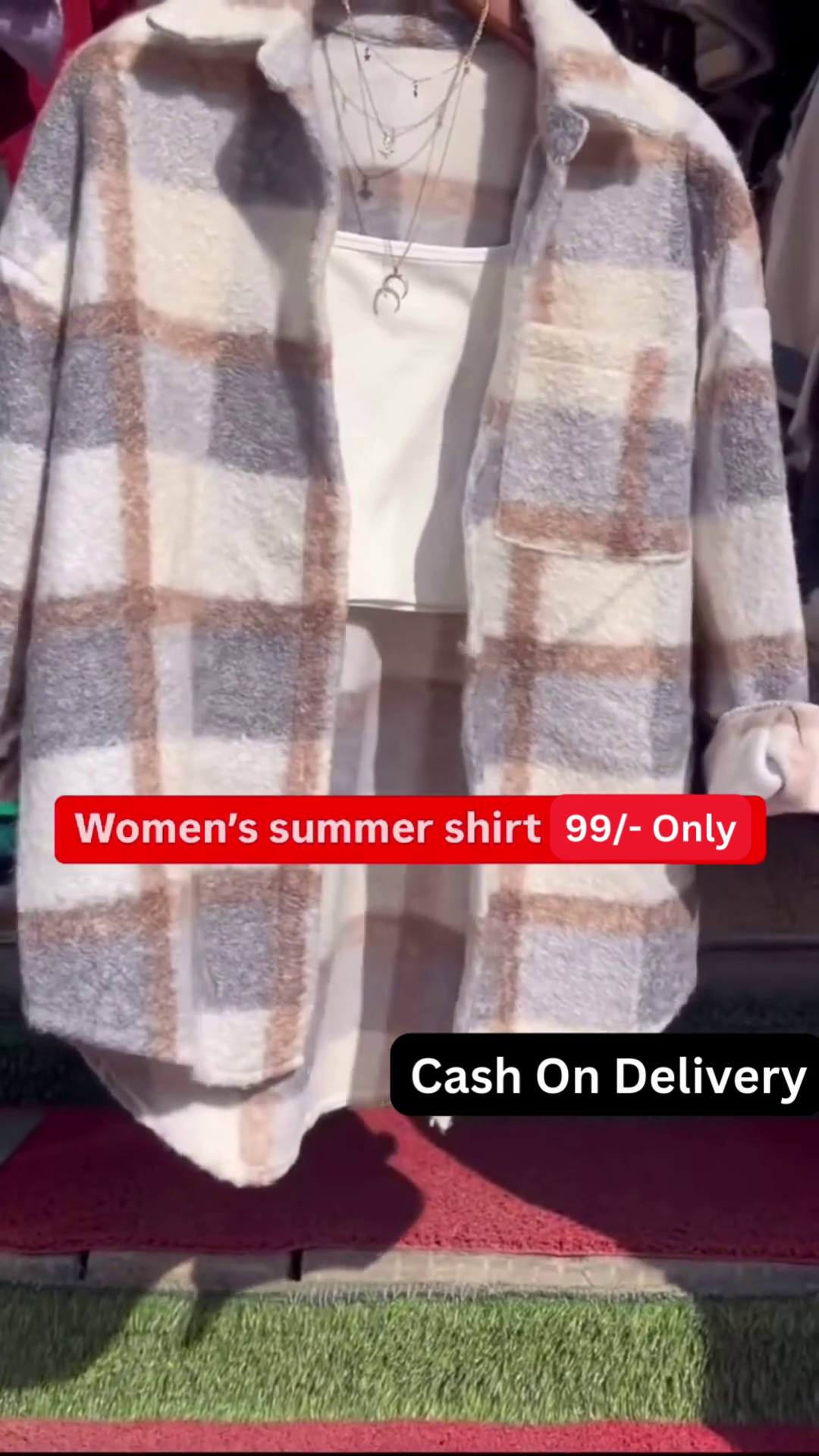 The overall impression is a comfortable and stylish look that is easy to wear for various occasions. The plaid shacket provides a touch of texture and pattern, while the layered top and delicate necklace add subtle details that elevate the outfit. This combination suggests a trendy yet effortless approach to everyday fashion. The availability in five colors, as indicated in the image context, further highlights the versatility of this shacket style, allowing consumers to choose options that best suit their personal preferences. This type of outfit is well-suited for transitional weather or for creating a cozy and stylish layered look.