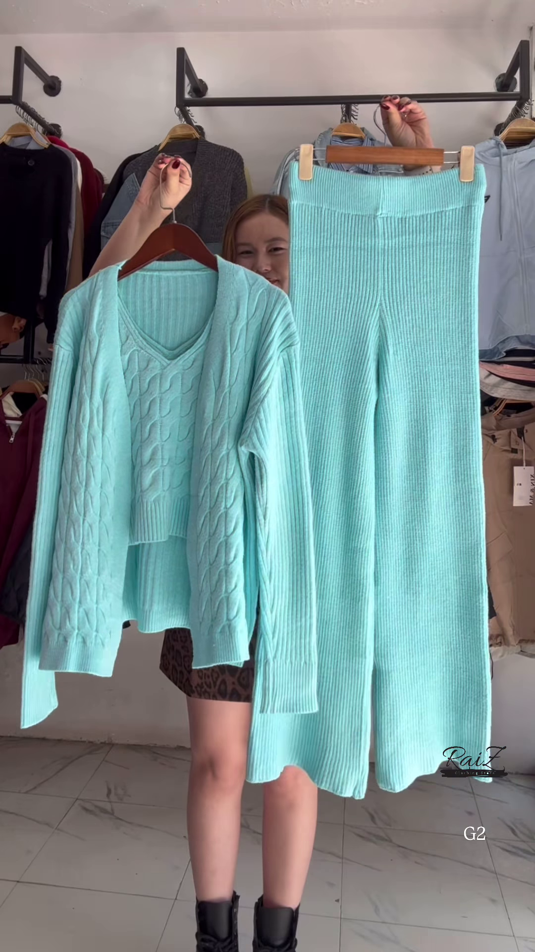 - 🔷 Light Blue: Ribbed knit cardigan + V-neck sweater + matching pants with cable detailing
