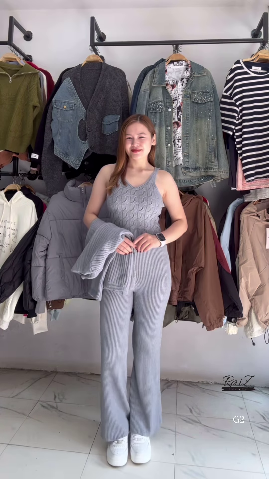 - 🌫 Grey: Coordinated cardigan, V-neck sweater, and flared pants in soft grey knit