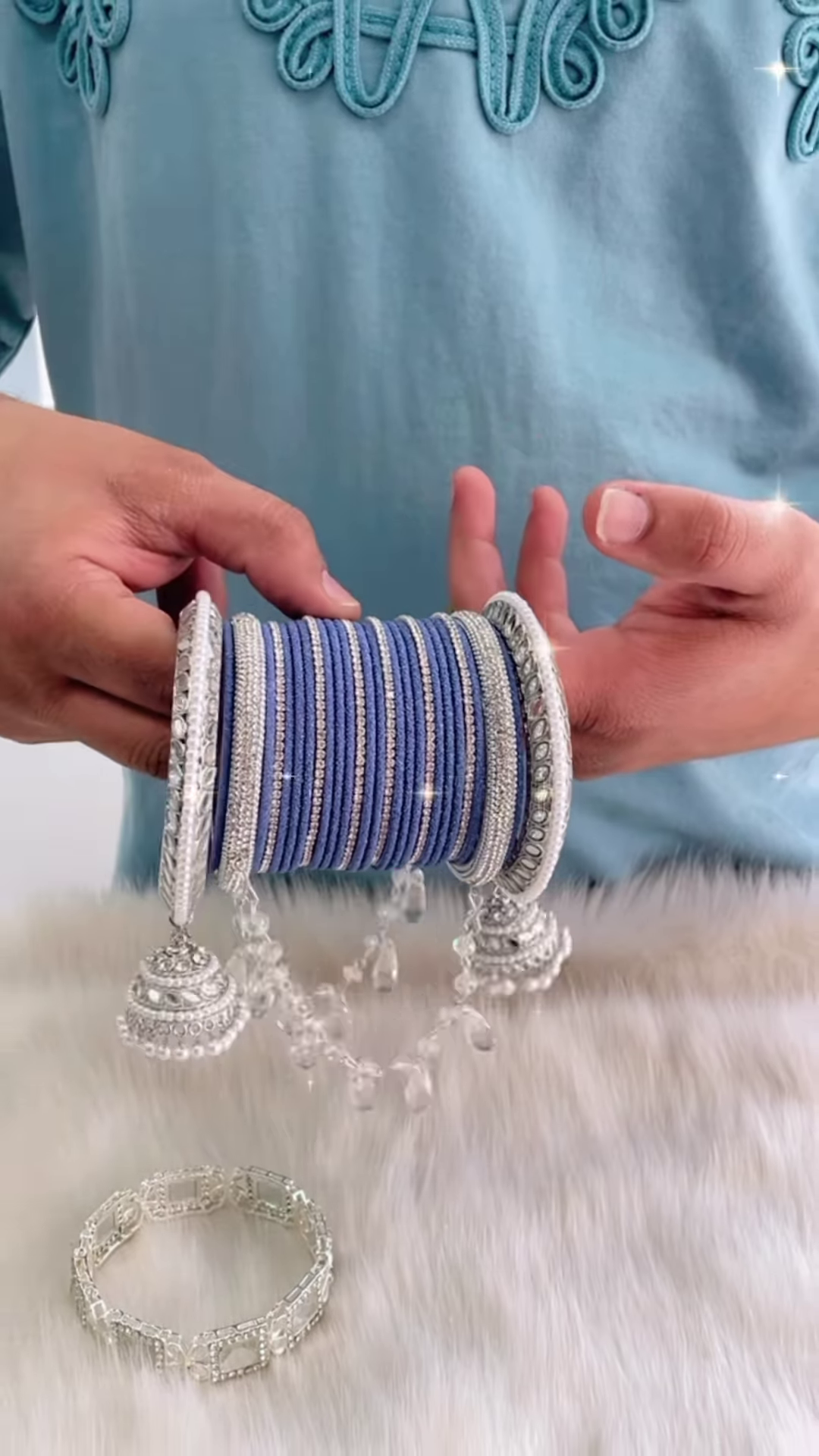 This comprehensive bangle set is specifically designed for bridal wear, engagements, pre-wedding ceremonies like sangeet and mehndi, and grand festive occasions in Ahmedabad, Gujarat, India. The combination of the deep navy blue, radiant silver, and sparkling accents makes it a versatile accessory that can be paired with a wide range of traditional Indian attire, including lehengas, sarees, and salwar suits. Wearing such a full and ornate set of bangles is not only a fashion statement but also holds cultural significance, symbolizing good fortune and celebration. This set offers a rich, layered look that is both timeless and exquisitely fashionable, ensuring the wearer stands out with grace and tradition.