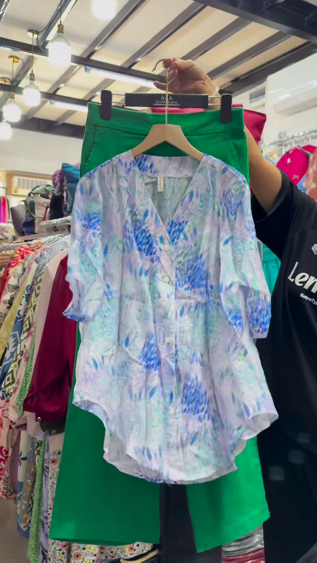 Balancing the shirt’s energy is a solid green skirt with a straight cut and minimal detailing—providing contrast and grounding the look. The skirt’s mid-length fall makes it versatile enough for warm-weather outings or cooler layered styling. The tailored waistband ensures a flattering fit, while the unembellished surface allows the upper half of the outfit to take center stage. This combination of color and minimalism makes it highly adaptable across styles, from artsy casual to semi-formal alternative fashion.