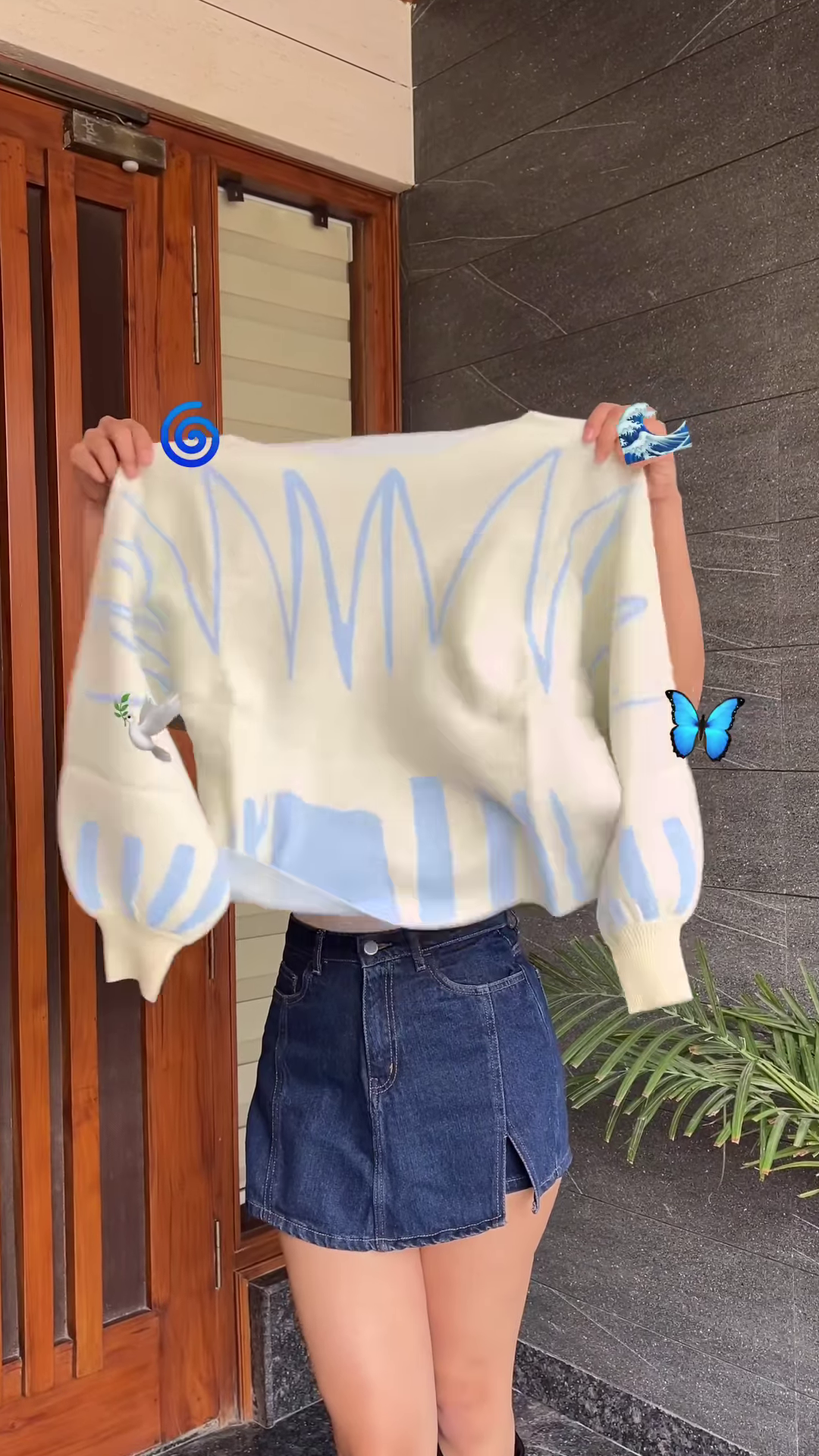 - 🌀 Abstract Cream: Cream knit with light blue abstract wave patterns + styled with denim skirt