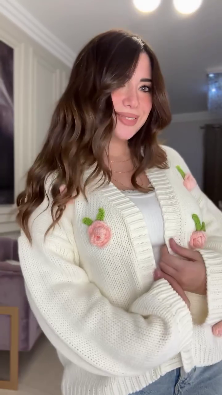 White Knit Cardigan with Pink Floral Appliqué 🌸🤍 – Button-Up Layer Styled with Gold Necklaces & Light Denim